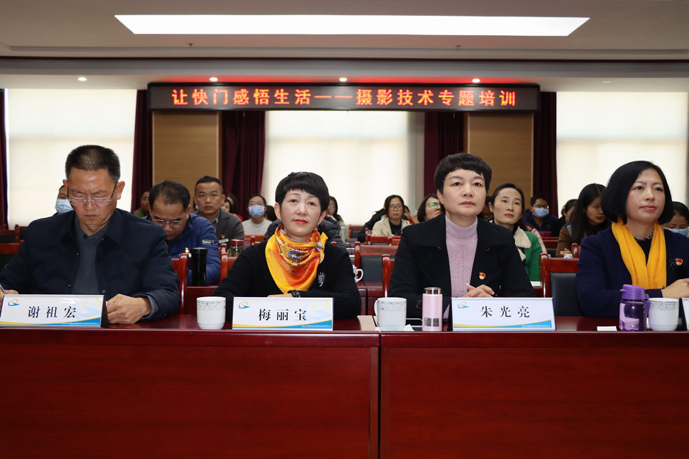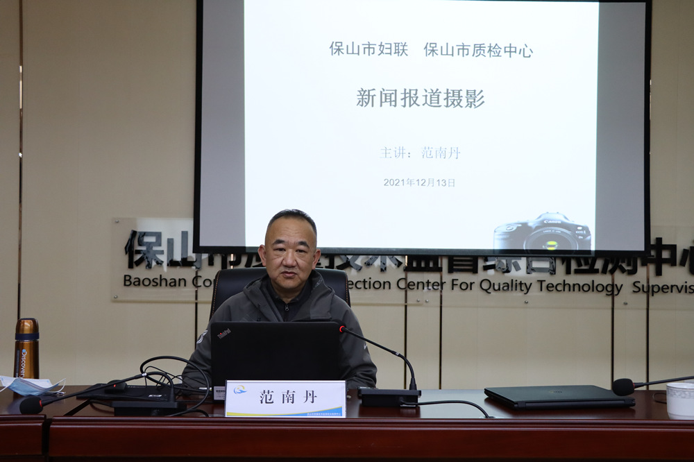 在多媒体报告厅,保山市摄影家协会秘书长、保山日报主任记者范南丹,以《新闻报道摄影》为题,通过丰富多彩的图片、视频新闻报道案例,从新闻摄影的概念、原则、标准及要素等方面进行理论讲授,从新闻摄影的主题拟定、形象展示、影像构图等方面进行拍摄器械、技巧的操作演示。