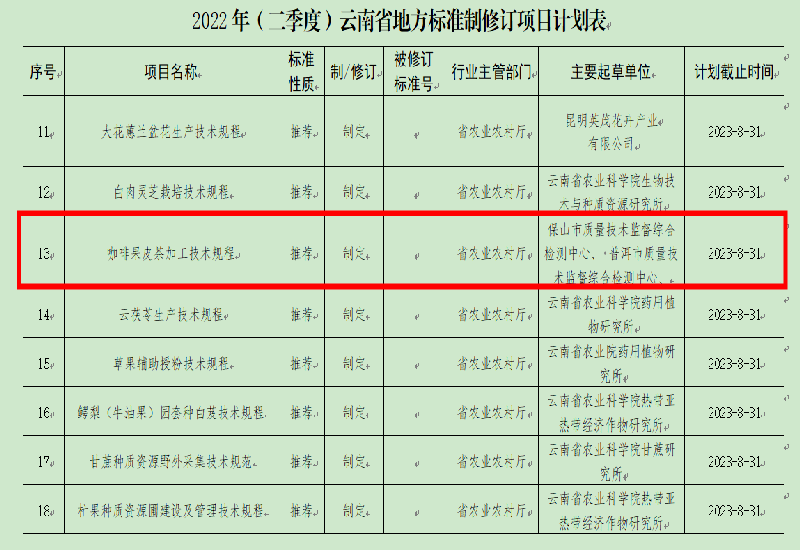 近日,接云南省市场监督管理局通知(云市监函〔2022〕156号),由市质检中心牵头制订的《云南省地方标准咖啡果皮茶加工技术规程》喜获立项,标准的制订将填补我国在咖啡果皮加工领域的空白。