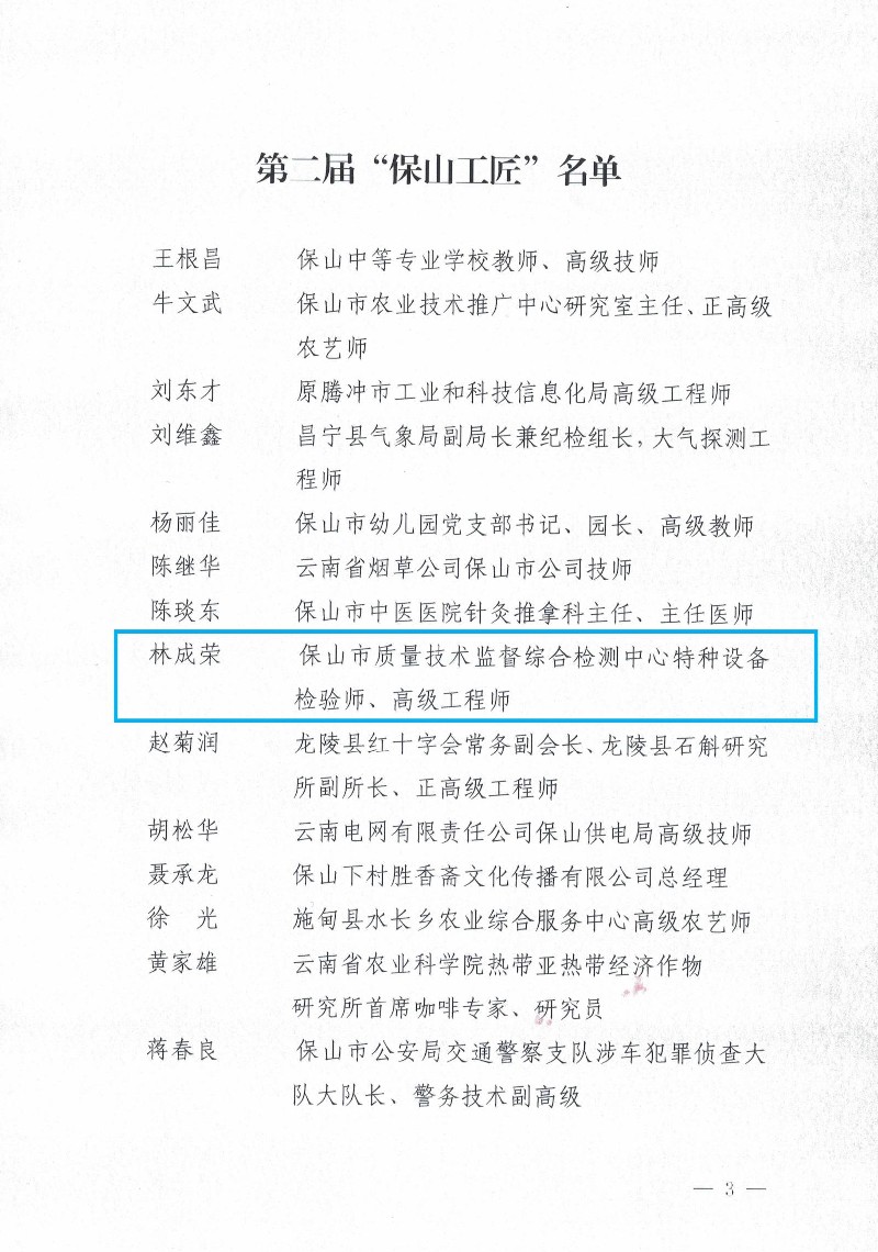 根据《保山市总工会中共保山市委组织部保山市人力资源和社会保障局关于授予王根昌等15名同志“保山工匠”称号的通报》(保工发〔2022〕35号),保山质检中心高级工程师林成荣同志荣获保山市第二届“保山工匠”称号。
