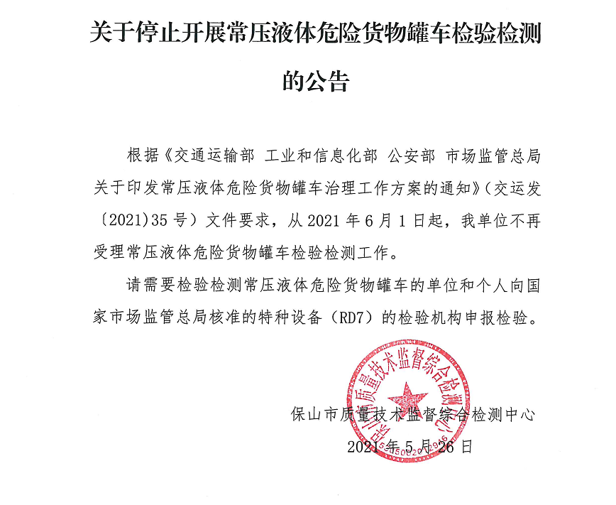 根据《交通运输部 工业和信息化部 公安部 市场监管总局关于印发常压液体危险货物罐车治理工作方案的通知》(交运发〔2021)35号)文件要求,从2021年6月1日起,我单位不再受理常压液体危险货物罐车检验检测工作。