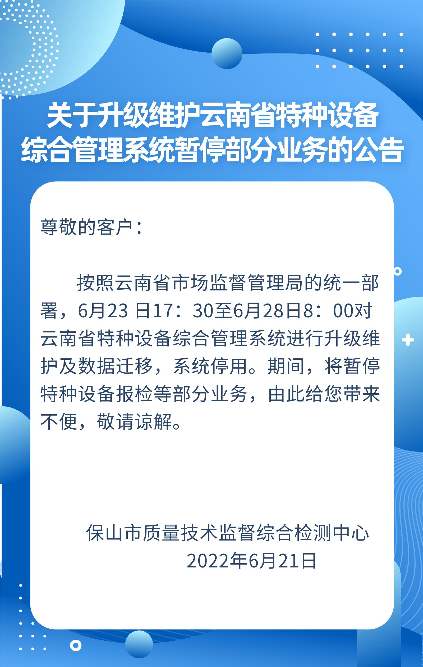关于升级维护云南省特种设备综合管理系统暂停部分业务的公告