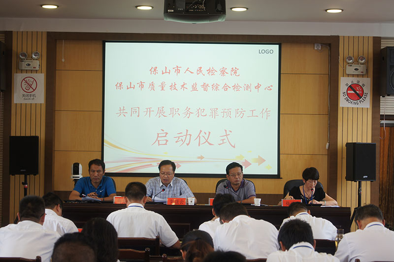 在启动仪式上,保山中心主任梅丽宝介绍了中心近年来党风廉政建设和行业作风建设的情况,并宣读了《保山市人民检察院保山市质量技术监督综合检测中心关于共同开展职务犯罪预防工作实施意见》(保技检联发〔2015〕1号)。刘强云副检察长就共同开展预防职务犯罪工作提出三点要求:一是充分认识开展预防职务犯罪工作的重要性。共同开展预防职务犯罪工作是落实中央反腐倡廉建设的需要,是促进保山中心健康发展的需要,是保护保山中心全体干部职工健康成长的需要。二是突出重点,切实提高预防职务犯罪工作时效。以强化教育为切入点,做到学习教育常抓不懈;以制度建设为着力点,建立健全制度体系;以监督制约为突破点,强化监督预防措施。三是加强领导,努力把预防职务犯罪工作落到实处。保山中心领导要全面落实两个责任,与保山市人民检察院加强协调配合,形成工作合力,并结合实际,注重调研,从源头上预防职务犯罪工作。