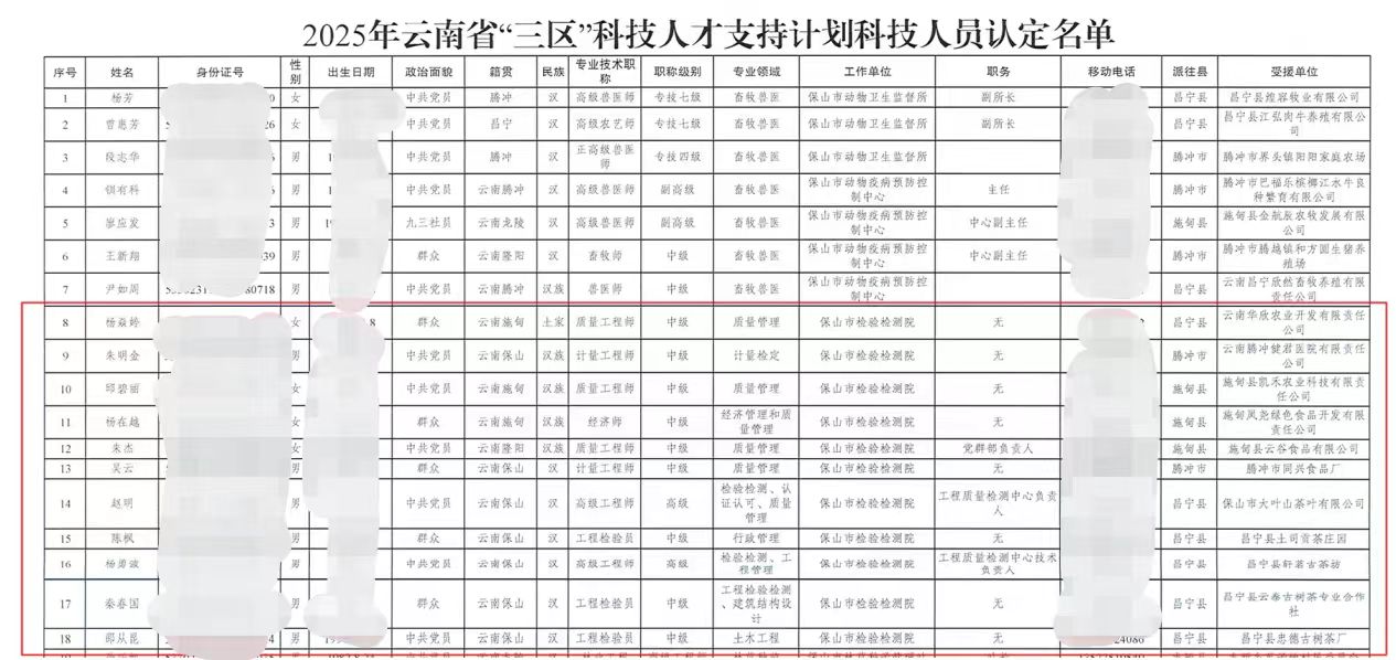 市检验检测院11人上榜2025年云南省“三区”科技人才支持计划科技人员认定名单