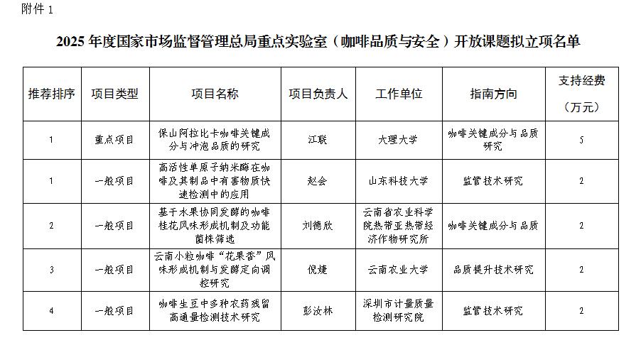 关于2025年度国家市场监督管理总局重点实验室(咖啡品质与安全)开放课题拟立项名单评审结果的公示