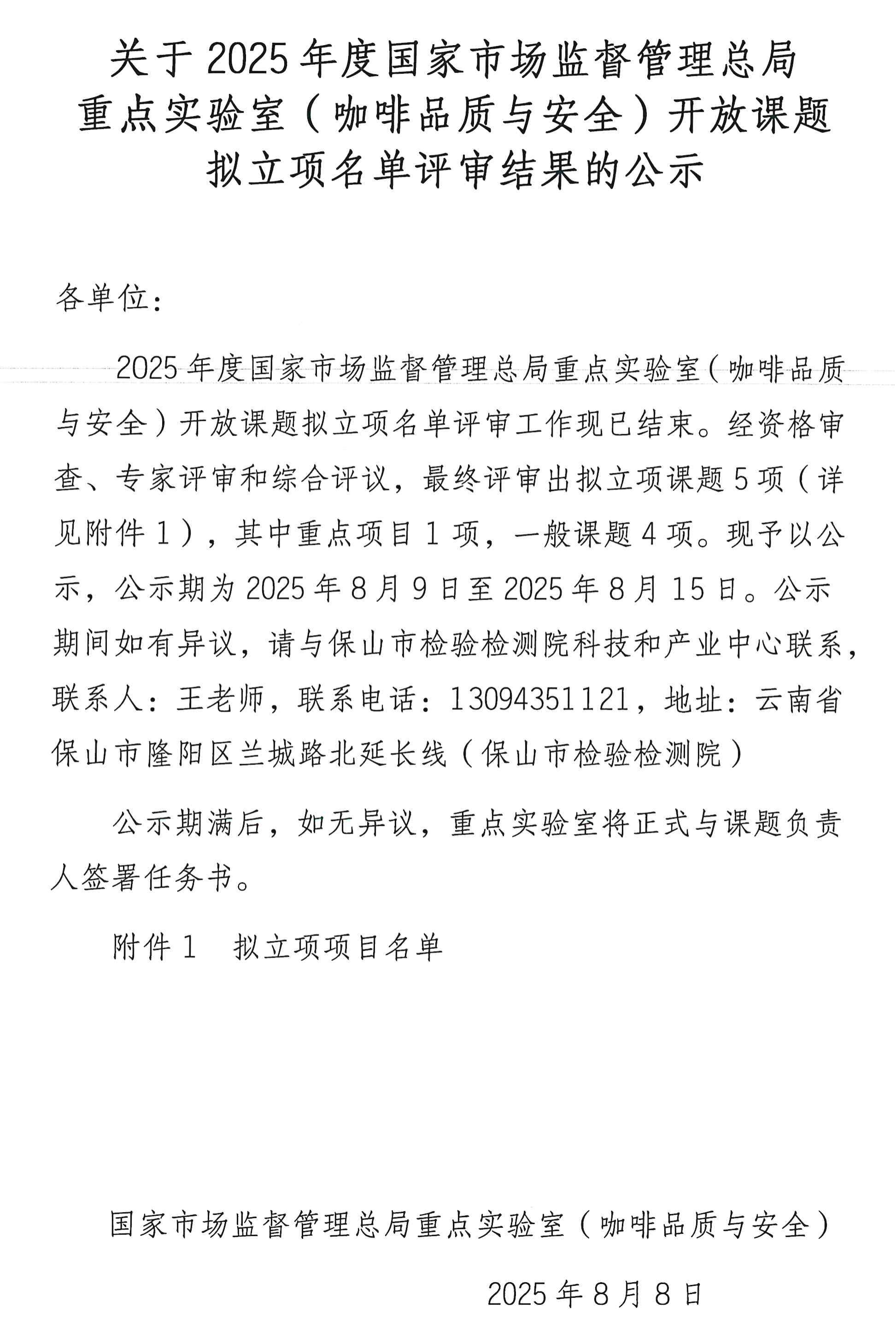 关于2025年度国家市场监督管理总局重点实验室(咖啡品质与安全)开放课题拟立项名单评审结果的公示.docx